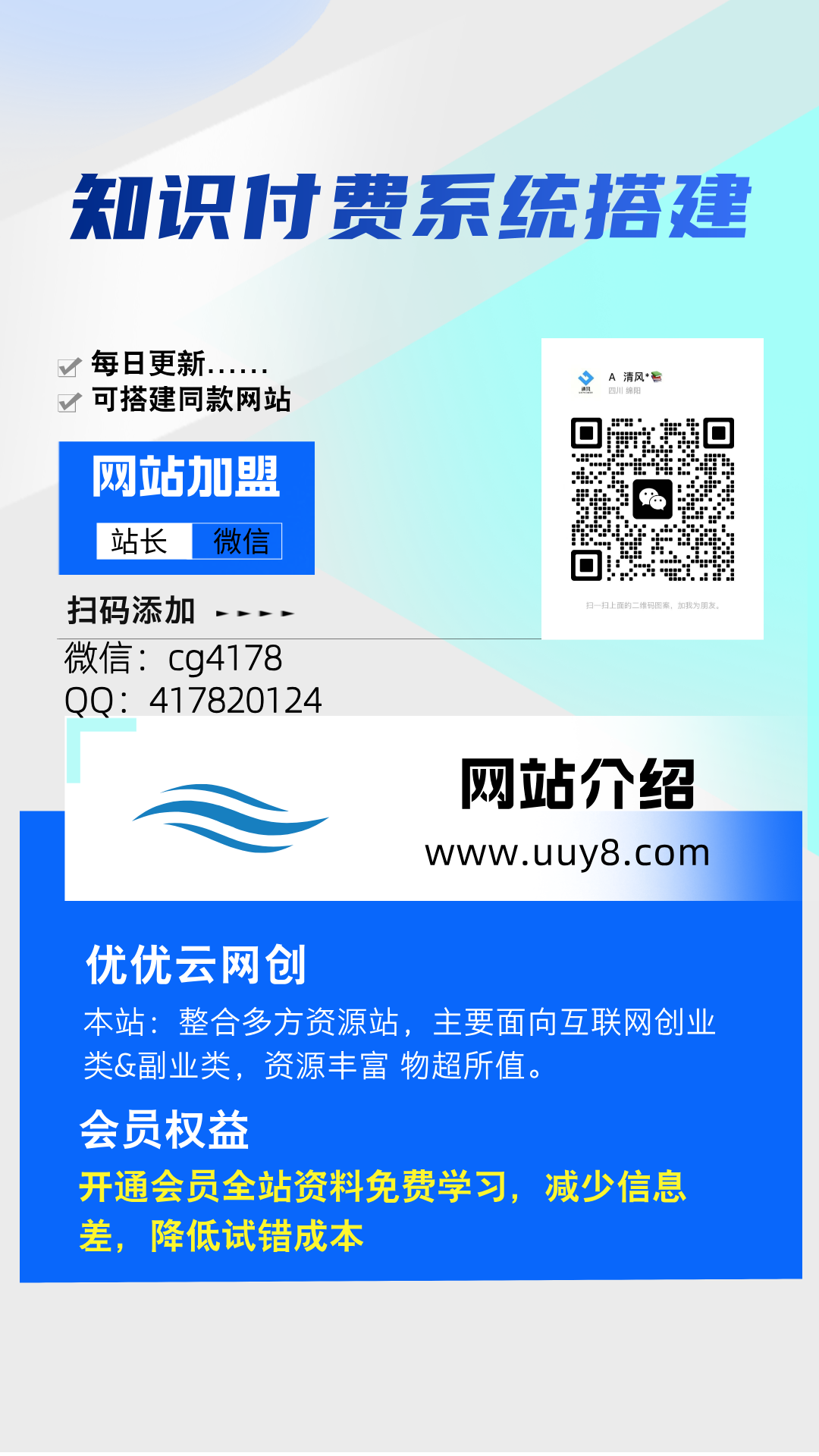 加盟优优云网创,加盟搭建同款知识付费资源网站,实现长期稳定被动收入~